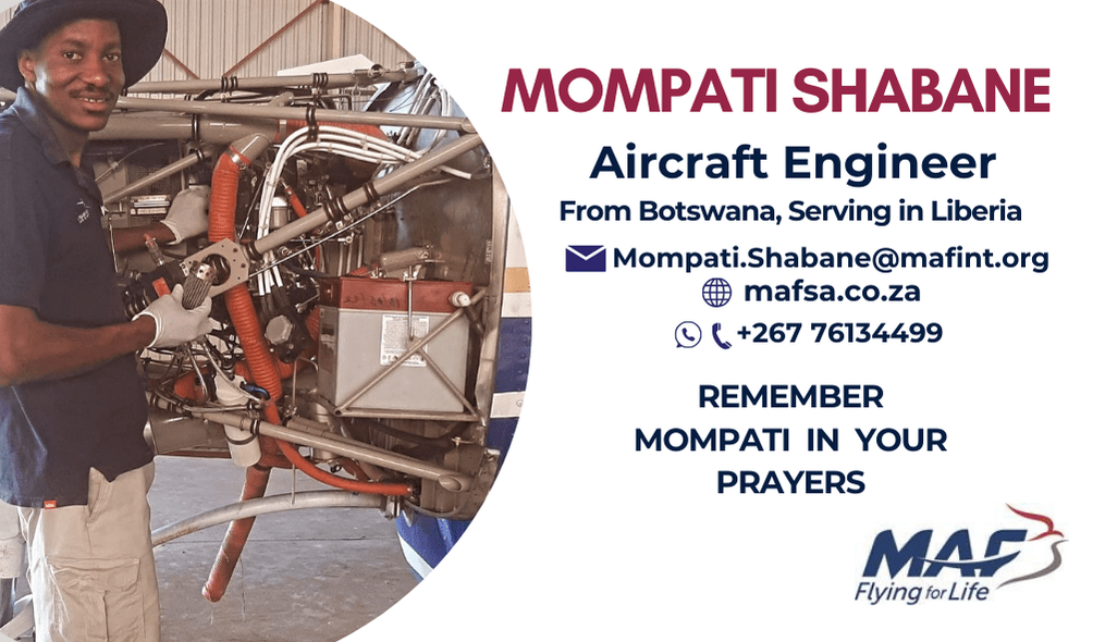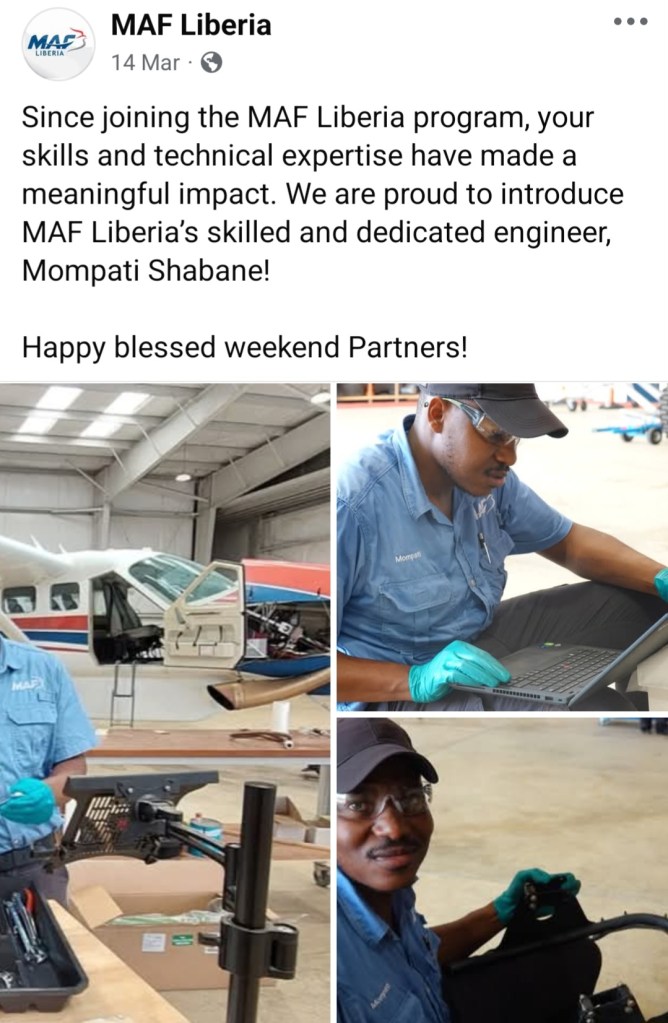 My name is Mompati Shabane . I am privileged to be serving God with my life, technical skills and talents as an Aircraft Engineer with Mission Aviation Fellowship International in Liberia . A skilled and purpose oriented engineer who holds both the FAA Airframe & Powerplant License and an ICAO Part 66 Aircraft Maintenance Engineer’s License